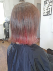 こちらのモデルさんはインナーを一度ブリーチで抜いてから塩基性カラーのピンクをかぶせてい