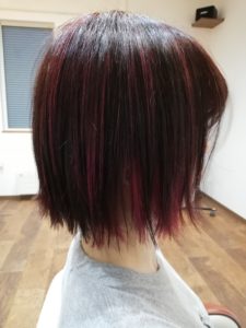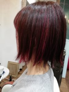 レイヤー無しのシンプルなボブですが、切り口をあえてざっくり見せて ハイライトにピンクを乗せて動きをプラス!